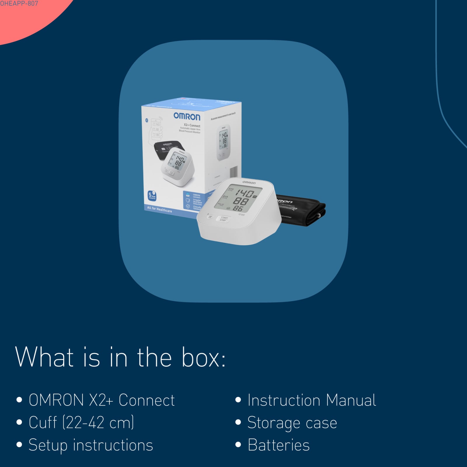 X2+ Connect blood pressure monitor, medium soft cuff (HEM-RML31), 4 "AA" batteries, instruction manual 1 & 2.